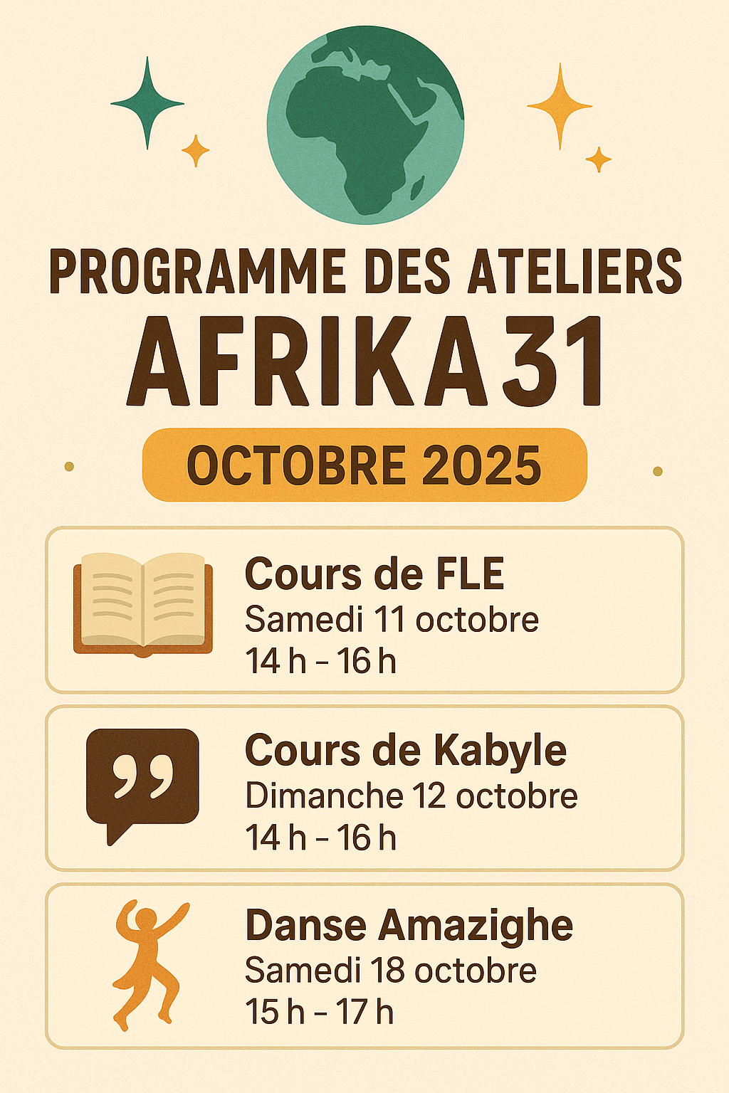 À travers des événements culturels, des ateliers, des cours d’alphabétisation et des actions de sensibilisation, nous renforçons les liens entre communautés et partageons notre patrimoine kabyle.
